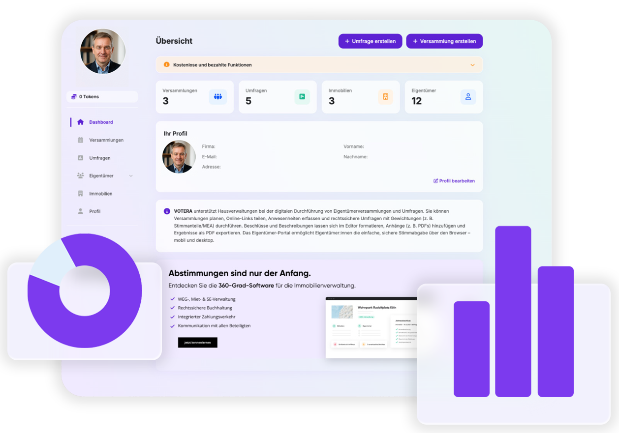 Mit VOTERA führen Sie Eigentümerversammlungen, Umlaufbeschlüsse und Umfragen einfach digital durch – rechtssicher, transparent und in wenigen Minuten eingerichtet.